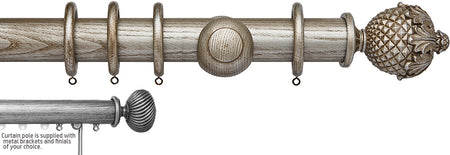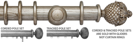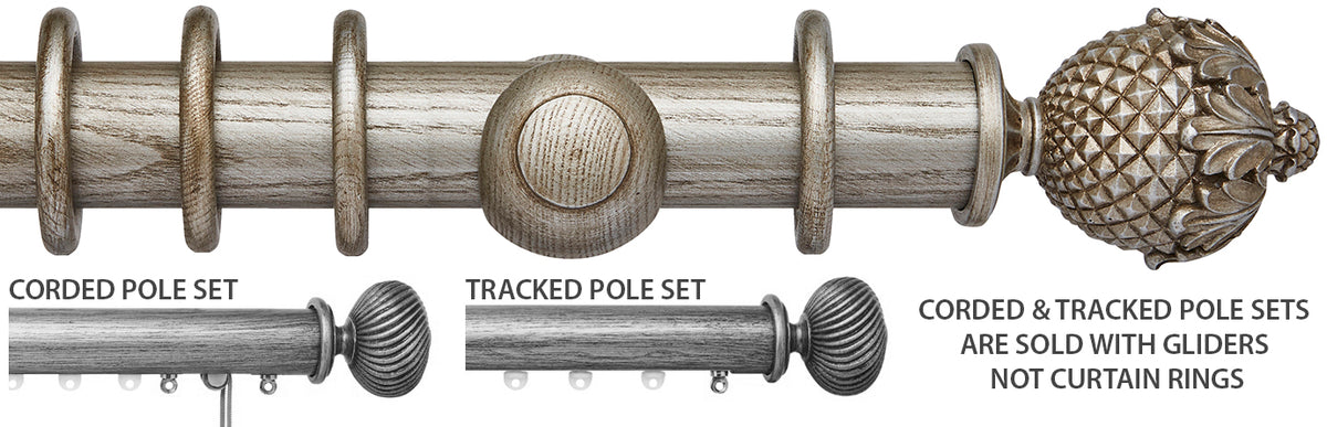 Ashbridge 45mm Corded/Tracked Wood Curtain Pole in Baroque Silver with solid resin Botanical finials. Ash wood has been specially selected for the Ashbridge Collection, finished in a way that allows the beauty of the grain to show through. Ashbridge is a celebration of British heritage built on attention to detail, from the selection of wood used to the designs and colour finishes. Combining the beauty of a wood pole with the smooth functionality of a track, any Ashbridge pole can be ordered made to measure as corded to allow an added level of convenience and control. Your made to measure pole will be carefully hand made by inserting a metal track into the underside of the pole along with quality components you can rely on. Your curtains can then be hooked onto the gliders in the track, removing the need for rings. This gives a stunning finished look with the curtain heading running much tighter to the pole. The six finial designs draw inspiration from stately homes & British gardens with influences including Neo-Classical Rococo & William Morris. Combining these unique designs & finishes the collection brings a modern-day twist to classically inspired designs. While the most decorative finials are cast from a solid resin mould to deliver intricate detailing, the Chatsworth finial is carved from Solid Ash.