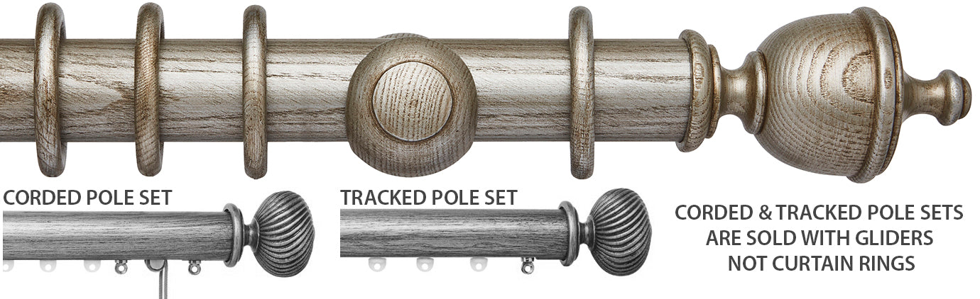 Ashbridge 45mm Corded/Tracked Wood Curtain Pole in Baroque Silver with solid ash Chatsworth finials. Ash wood has been specially selected for the Ashbridge Collection, finished in a way that allows the beauty of the grain to show through. Ashbridge is a celebration of British heritage built on attention to detail, from the selection of wood used to the designs and colour finishes. Combining the beauty of a wood pole with the smooth functionality of a track, any Ashbridge pole can be ordered made to measure as corded to allow an added level of convenience and control. Your made to measure pole will be carefully hand made by inserting a metal track into the underside of the pole along with quality components you can rely on. Your curtains can then be hooked onto the gliders in the track, removing the need for rings. This gives a stunning finished look with the curtain heading running much tighter to the pole. The six finial designs draw inspiration from stately homes & British gardens with influences including Neo-Classical Rococo & William Morris. Combining these unique designs & finishes the collection brings a modern-day twist to classically inspired designs. While the most decorative finials are cast from a solid resin mould to deliver intricate detailing, the Chatsworth finial is carved from Solid Ash.