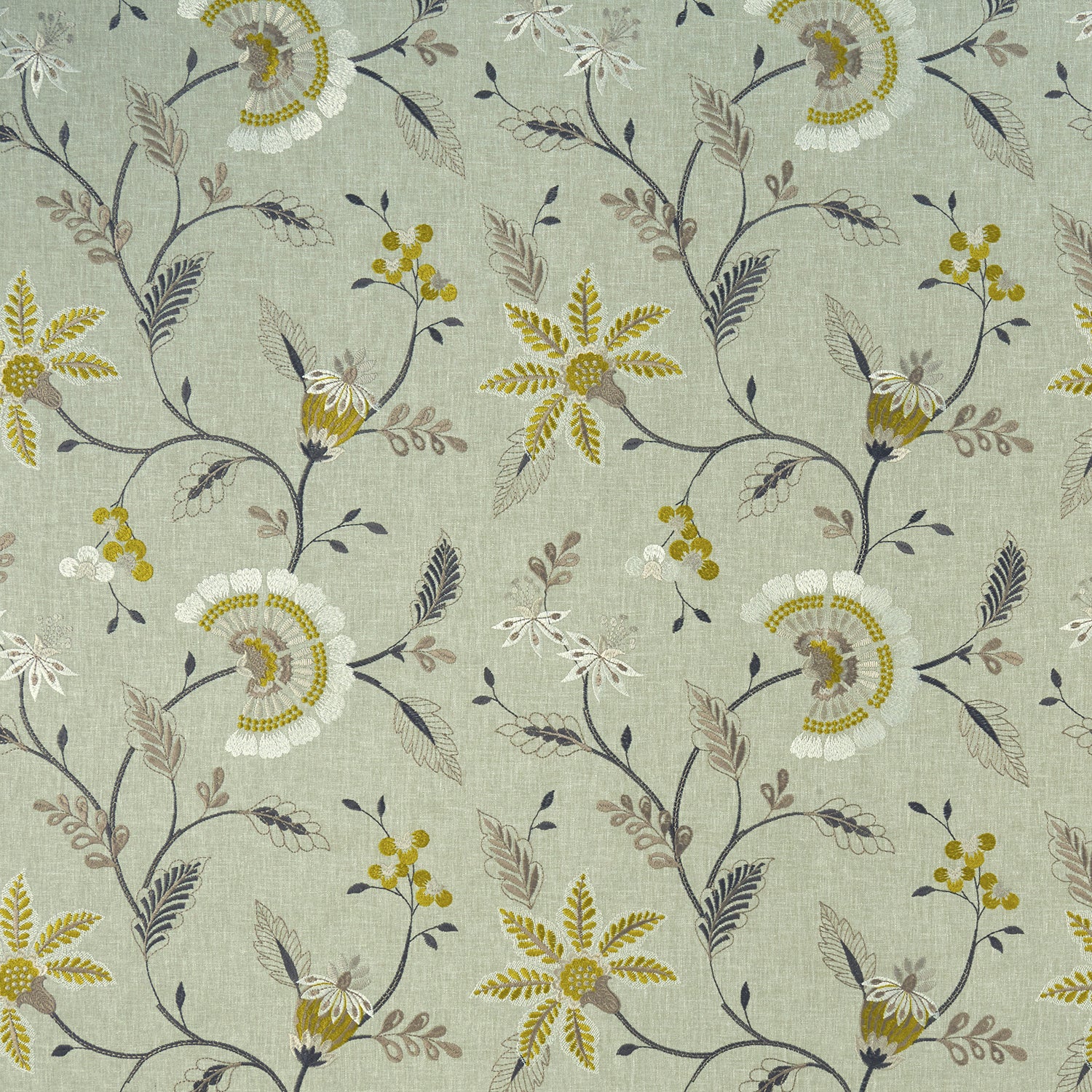 Clarke & Clarke Halcyon Delamere Fabric in Chartreuse Colourway. Delamere is an embroidered fabric with a paisley design.