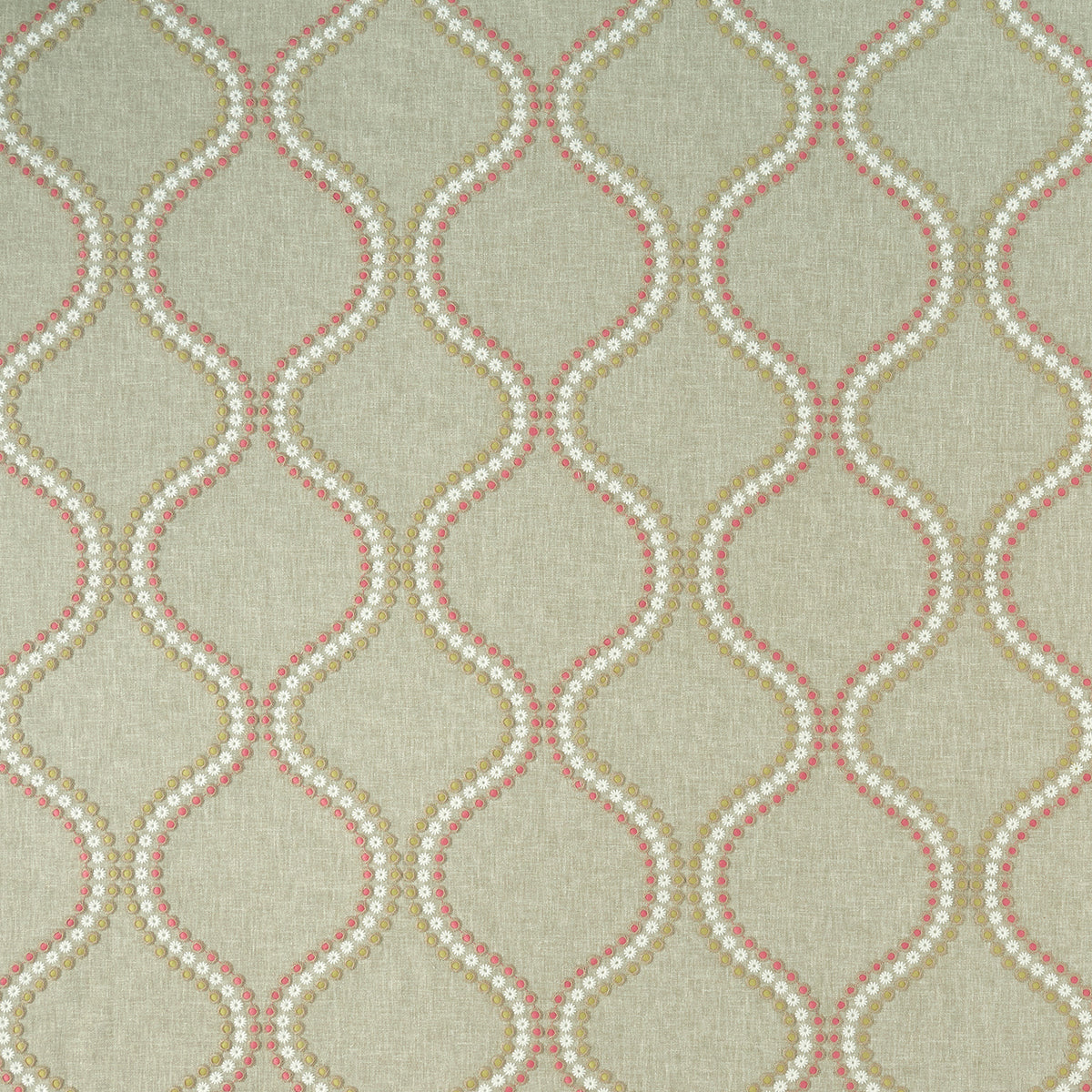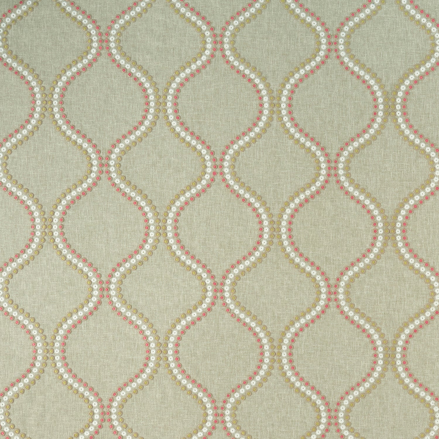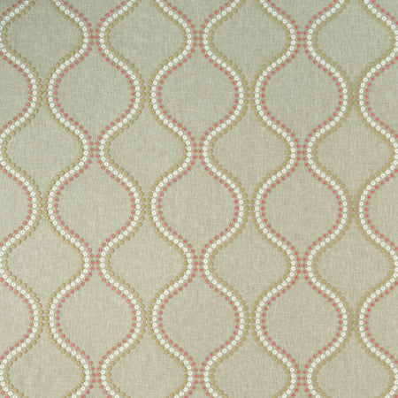 Clarke & Clarke Halcyon Layton Fabric in Pink/Apple Colourway. Layton is an embroidered fabric with a wavy trail design.