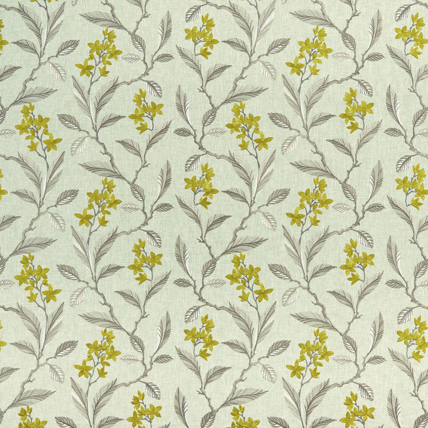 Clarke & Clarke Halcyon Melrose Fabric in Chartreuse Colourway. Melrose is an embroidered fabric with a leafy/floral trail design.