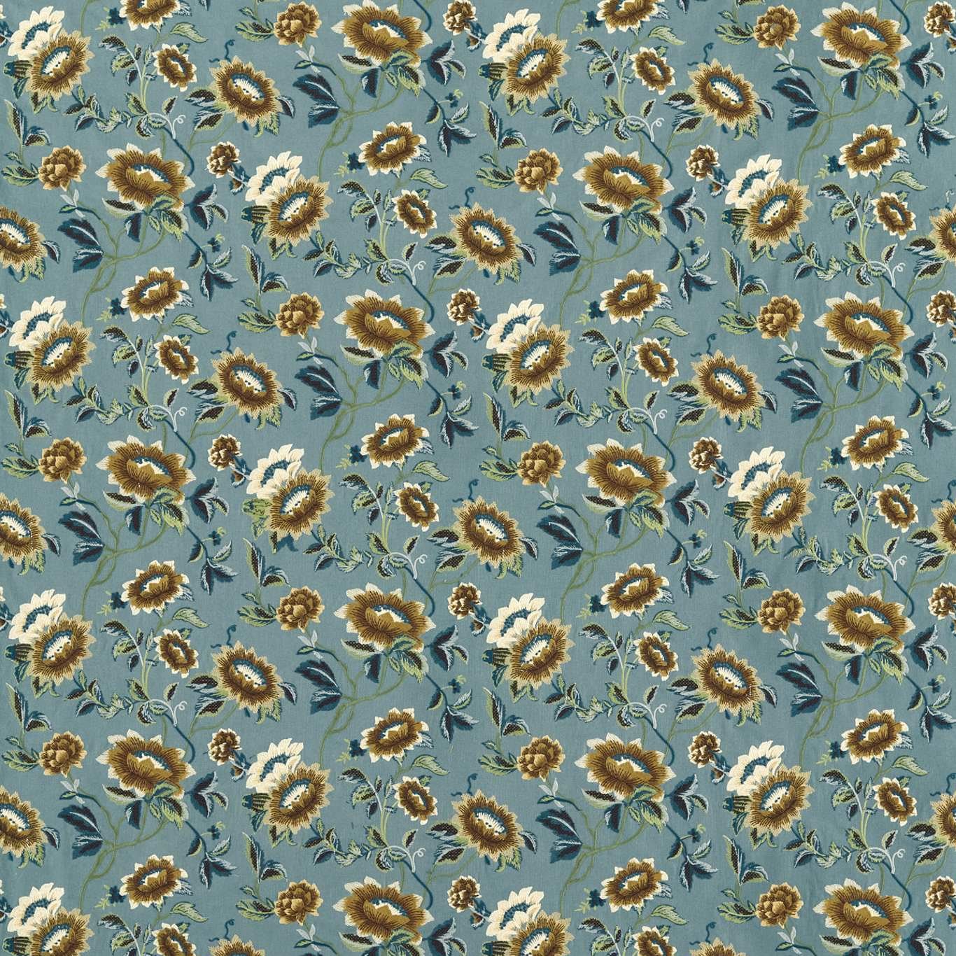 Clarke & Clarke Wedgwood Tonquin Chartreuse/Denim Embroidery Fabric. Tonquin is an embroidered fabric that is inspired by Xiaolan, the 'City of Chrysanthemums' in China's Guangdong province. Tonquin features bold, oversized Chrysanthemum blooms. It is a mixture of stylised florals and delicately drawn foliage.