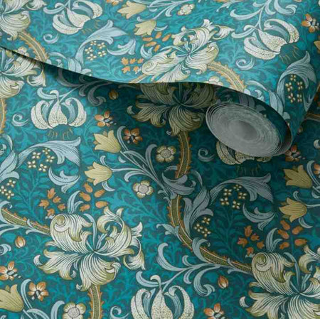 Clarke & Clarke William Morris Golden Lily Teal Wallpaper. Golden Lily features entwined lily stems amid a bed of other bright flowerheads. It is impactful and dramatic, this is a striking interpretation of William Morris's timeless heritage design. With a reduced scale, Golden Lily is a versatile decorating solution for spaces of all sizes.