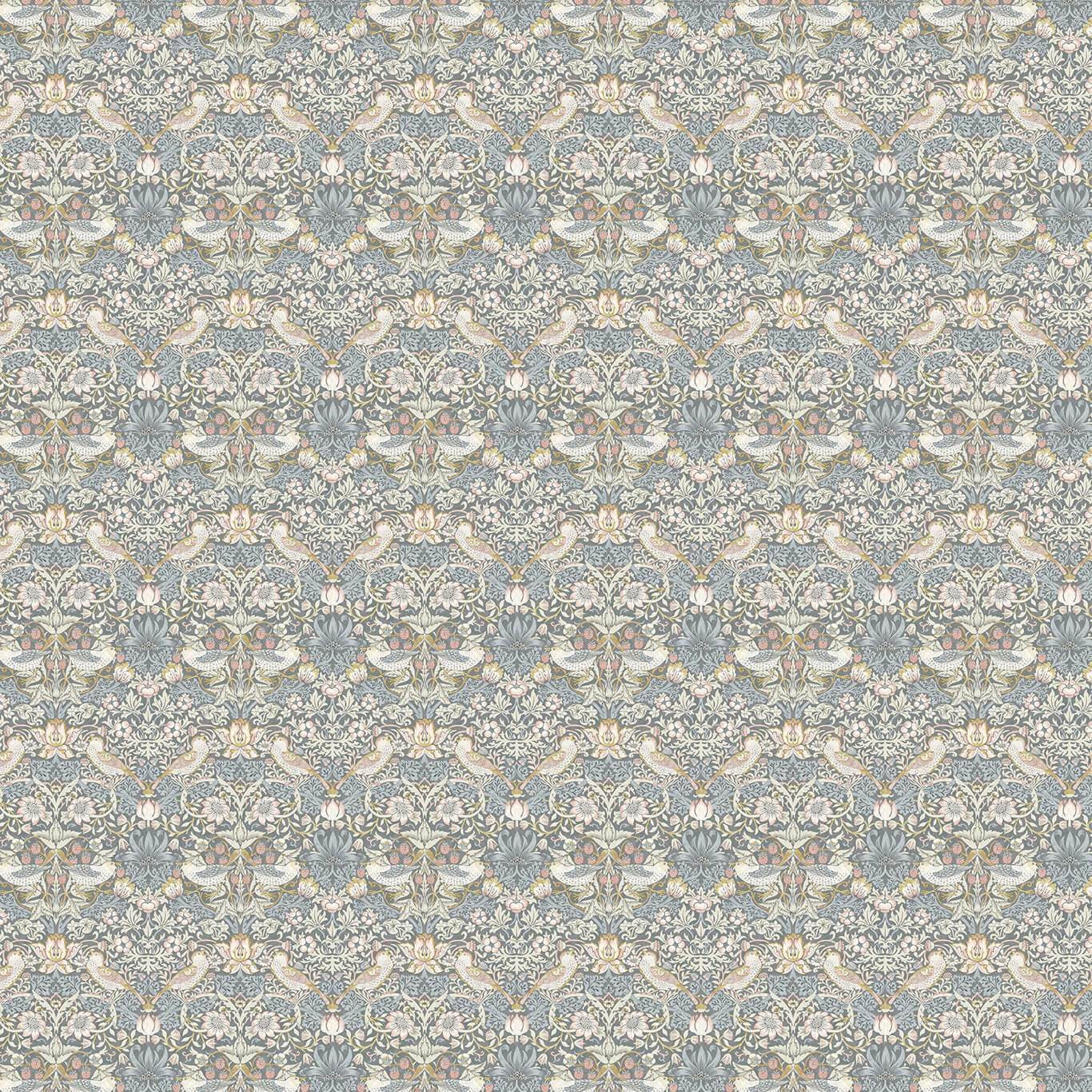 Clarke & Clarke William Morris Strawberry Thief Slate/Blush Fabric. Strawberry Thief is William Morris's most iconic pattern, it tells the story of a cheeky, fruit-thieving bird. Intricate and highly ornamented, this cherished design is a riot of colour and expressive detail.