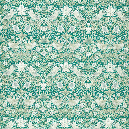 Clarke & Clarke William Morris Weaves Strawberry Thief Jacquard Teal Fabric. Subtle tones in the weave of this fabric reveal the cheeky Strawberry Thief in a new light. The design has been enlarged, and the use of colour creates depth in this soft jacquard fabric.