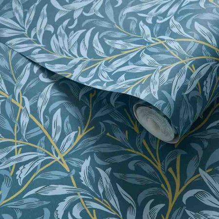 Clarke & Clarke William Morris Willow Boughs Denim Wallpaper. Willow Boughs is the instantly recognisable William Morris pattern that is inspired by nature. It is deceptively simple and features delicately entwining stems and curling leaves. A smaller-scale pattern offers enhanced usability whilst a new Teal colourway introduces an element of drama.