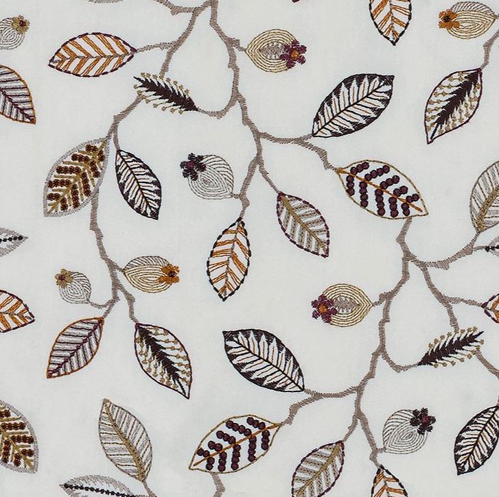 Fibre Naturelle Amore Mon Desir Fabric. Amore is a richly embroidered, cotton mix fabric with a natural and seed pod design.