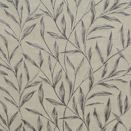 Fibre Naturelle Fontaine Charcoal Fabric. Fontaine is an elegant leaf embroidery, with a metallic thread on a natural background.
