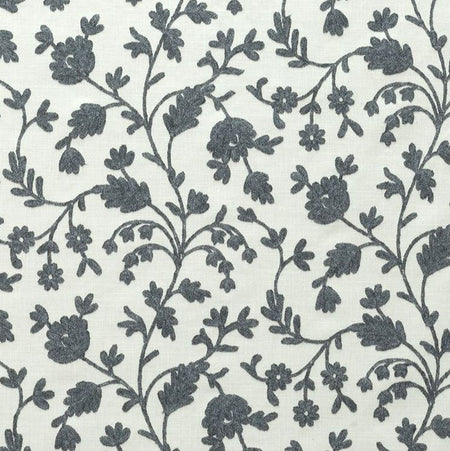 Fibre Naturelle Lucca Charcoal Fabric. Lucca is an embroidered floral fabric on a natural background.