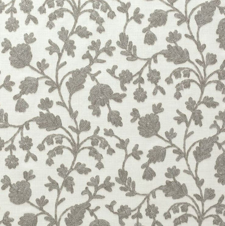 Fibre Naturelle Lucca Mink Fabric. Lucca is an embroidered floral fabric on a natural background.