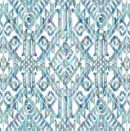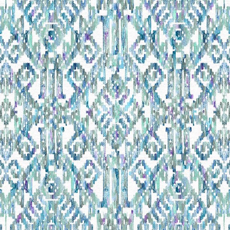 Fibre Naturelle Marrakesh Aqua Fabric. Marrakesh is a printed fabric with a vibrant ikat design.