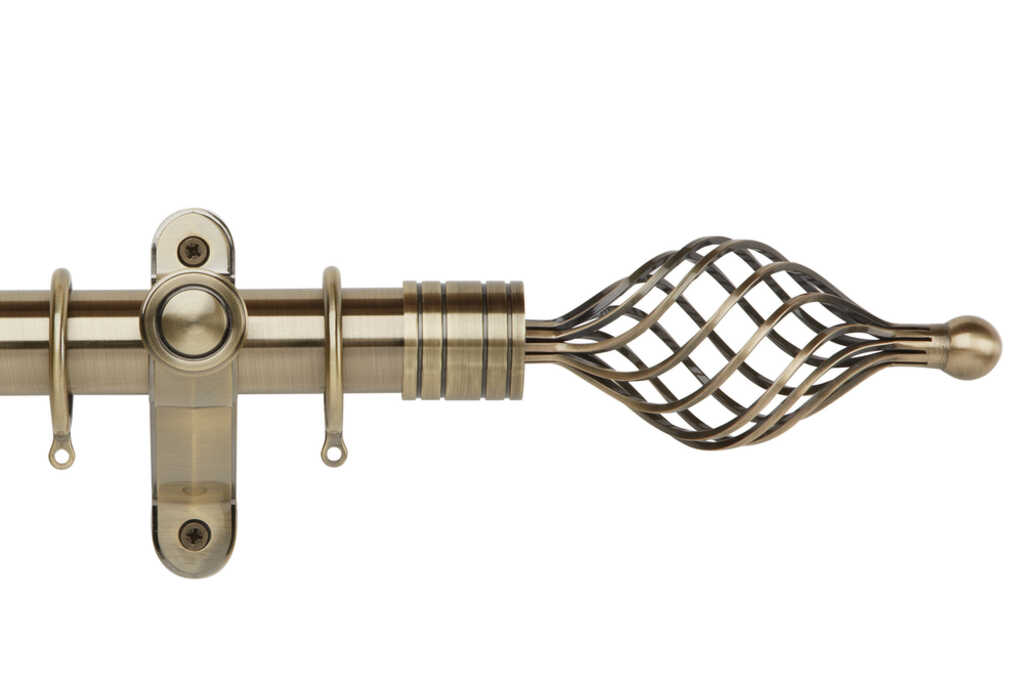 Galleria Metals 35mm Curtain Pole in a Burnished Brass effect finish with Twisted Cage finials. Galleria Metals 35mm metal curtain poles from Hallis Hudson are a luxury curtain pole with simple, yet elegant finials to choose from. The Galleria Metals collection is available in 4 finishes, Burnished Brass effect, Brushed Silver effect, Black Nickel effect and Chrome.