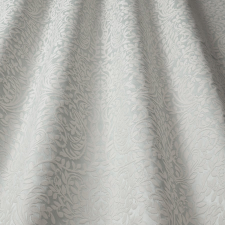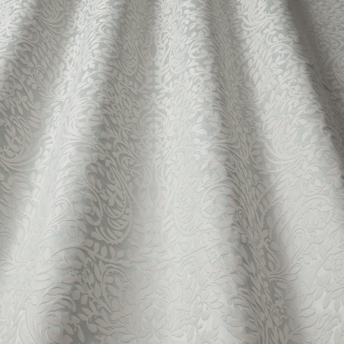 Iliv Interior Textiles Valentina, Alexandria Fabric in Azure Colourway. Alexandria is a woven fabric with a stunning damask design. Teatro collection offers majestic grandeur across classical designs. Sophisticated cut velvets and all-over Jacobean embroideries on lustrious satins are layered with high density woven jacquards which creates exceptional relief to the designs.