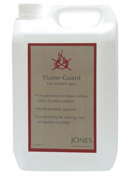 Jones Flame Guard Bottle. Flame-Guard is chemically neutral & odourless and if allowed to dry naturally, it should not cause shrinkage, or affect the properties or appearance of the fabric in anyway. The effectiveness of Flame-Guard is not affected by dry cleaning, natural wear or exposure to sunlight.