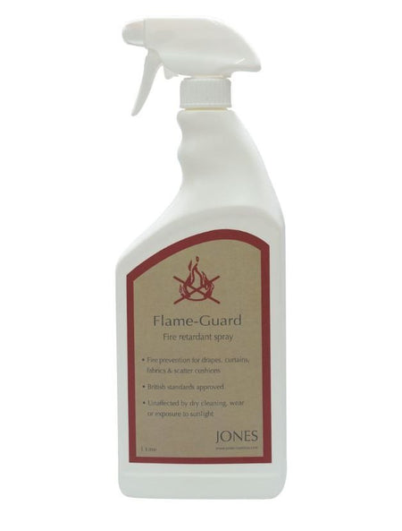 Jones Flame Guard Spray. Flame-Guard is chemically neutral & odourless and if allowed to dry naturally, it should not cause shrinkage, or affect the properties or appearance of the fabric in anyway. The effectiveness of Flame-Guard is not affected by dry cleaning, natural wear or exposure to sunlight.
