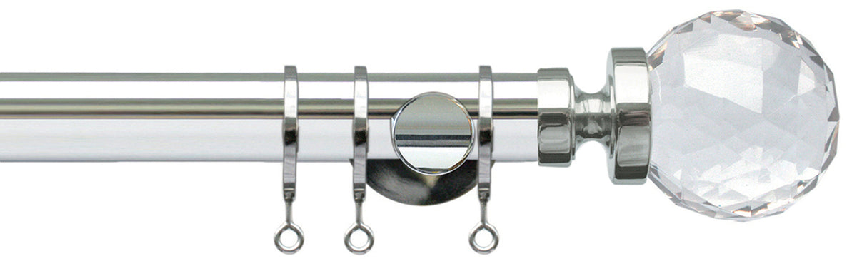 Jones Lunar Metal Curtain Pole 28mm in a Chrome finish with Clear Faceted Glass finials. The Jones Lunar curtain poles are an ultra contemporary curtain pole set that adds ultimate style and finesse to any modern decor.