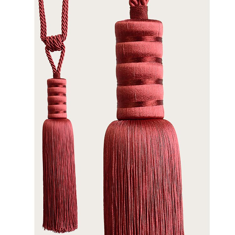 Laura Ashley Emily Curtain Tieback in Crimson. The Laura Ashley Emily Tassel Tieback will add a fashionable accent to any window, with a sleek barrel shaped body and contrasting colour detail.