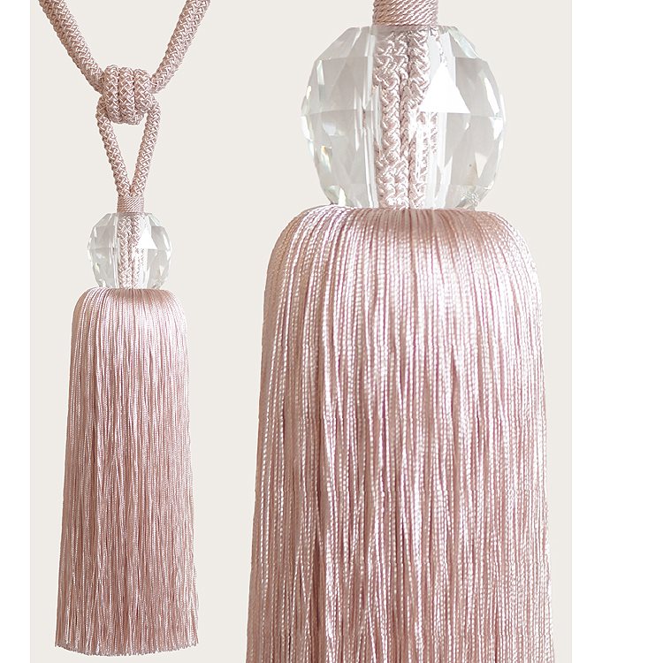 Laura Ashley Loren Curtain Tieback in Blush. The Laura Ashley Loren Tassel Tieback features a premium cut glass body and braided cord that will create Instant glamour and sophistication at any window.