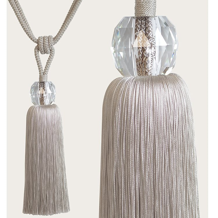 Laura Ashley Loren Curtain Tieback in Dove Grey. The Laura Ashley Loren Tassel Tieback features a premium cut glass body and braided cord that will create Instant glamour and sophistication at any window.