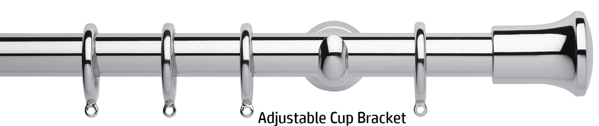 Neo 28mm metal curtain pole in a Chrome finish with Trumpet finials. A stunning, modern metal curtain pole with stylish brackets complete with nylon lined curtain rings to ensure a quiet, smooth travel along the pole.