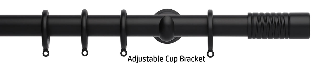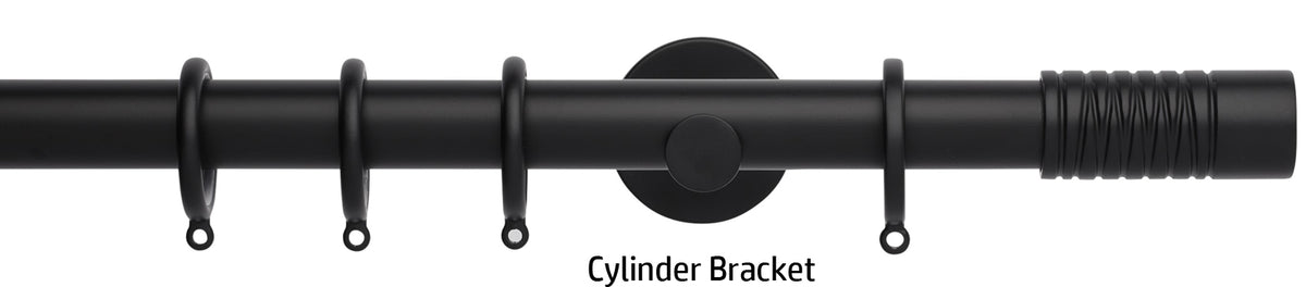 Neo 28mm metal curtain pole in a Matt Black finish with Wired Barrel finials. A stunning, modern metal curtain pole with stylish brackets complete with nylon lined curtain rings to ensure a quiet, smooth travel along the pole.