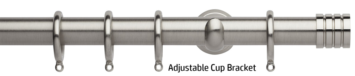 Neo 28mm metal curtain pole in a Stainless Steel finish with Stud finials. A stunning, modern metal curtain pole with stylish brackets complete with nylon lined curtain rings to ensure a quiet, smooth travel along the pole.