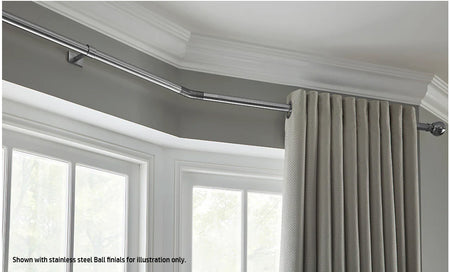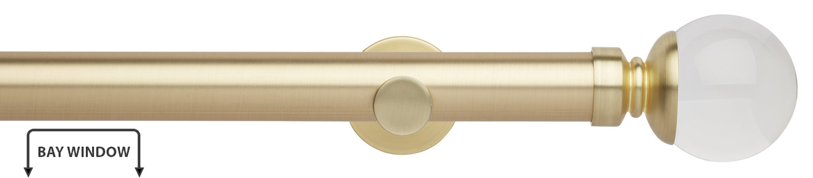 Rolls Neo Premium 28mm Eyelet Bay Window Curtain Pole in Gold with Clear Ball finials. The new Neo Eyelet Bay Window curtain pole has been designed to work at its best with eyelet curtains and is the perfect solution to complement and enhance your interior. The new Neo Bay Pole brackets have been engineered to the high standards of the Neo range. Being solid diecast they have maximum strength and weight capacity. This focus on attention to detail ensures your bay pole adds to the beauty of your room and will stand the test of time. The new Neo Bay Pole brackets are completely hidden by the curtains once installed. The new Neo Bay Pole Corner Joint is supplied as a straight piece which can easily be bent by hand to the angle required for your bay window.
