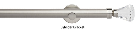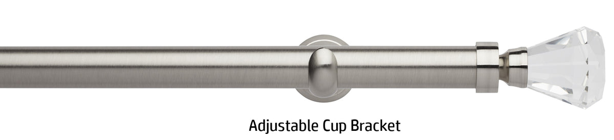 Rolls Neo Premium 28mm Metal Eyelet Curtain Pole in a Stainless Steel effect finish with Clear Faceted Trumpet finials and supplied with stylish cylinder brackets or adjustable cup brackets. A stunning addition to the ever popular Rolls Neo collection of contemporary metal curtain poles with a stylish, minimalistic look. The clear finials are solid lead crystal with a metal collar to combine with the existing Neo metal finishes. The Neo Premium finials are the ultimate expression of refined luxury.