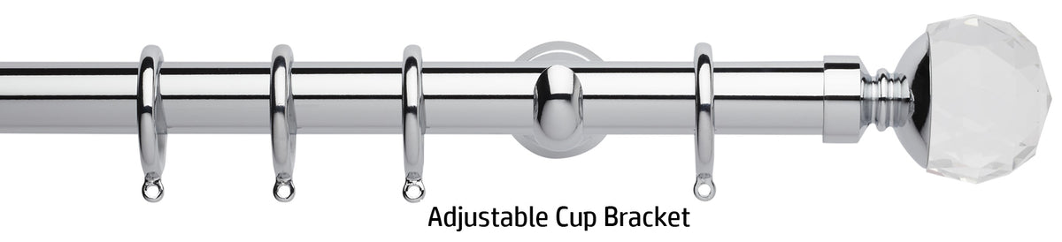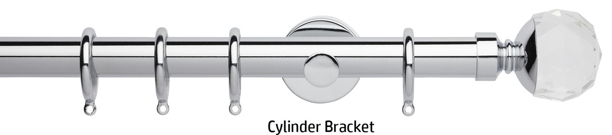 Rolls Neo Premium 28mm Metal Curtain Pole in a Chrome effect finish with Clear Faceted Ball finials, available with a choice of stylish cylinder brackets or adjustable cup brackets. A stunning addition to the ever popular Rolls Neo collection of contemporary metal curtain poles with a stunning yet minimalistic look. The clear finials are solid lead crystal with a metal collar to combine with the existing Neo metal finishes. The Neo Premium finials are the ultimate expression of refined luxury.