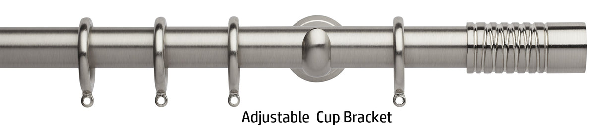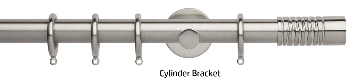 Neo 28mm metal curtain pole in a Stainless Steel finish with Wired Barrel finials. A stunning, modern metal curtain pole with stylish brackets complete with nylon lined curtain rings to ensure a quiet, smooth travel along the pole.