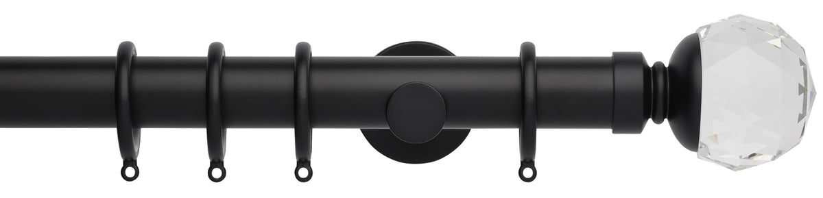 Rolls Neo Premium 35mm by Hallis Hudson Metal Curtain Pole in a Matt Black effect finish with Clear Faceted Ball finials and cylinder brackets. A stunning addition to the ever popular Rolls Neo collection of contemporary metal curtain poles with a stylish, minimalistic look. The Neo Premium finials are the ultimate expression of refined luxury.
