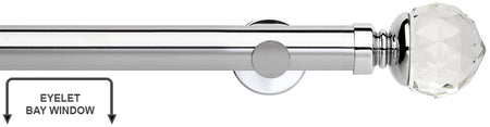 Rolls Neo Premium 35mm Eyelet Bay Window Curtain Pole in Chrome with Clear Faceted Glass Ball finials. The new Neo Eyelet Bay Window curtain pole has been designed to work at its best with eyelet curtains and is the perfect solution to complement and enhance your interior. The new Neo Bay Pole brackets have been engineered to the high standards of the Neo range. Being solid diecast they have maximum strength and weight capacity. This focus on attention to detail ensures your bay pole adds to the beauty of your room and will stand the test of time. The new Neo Bay Pole brackets are completely hidden by the curtains once installed. The new Neo Bay Pole Corner Joint is supplied as a straight piece which can easily be bent by hand to the angle required for your bay window.