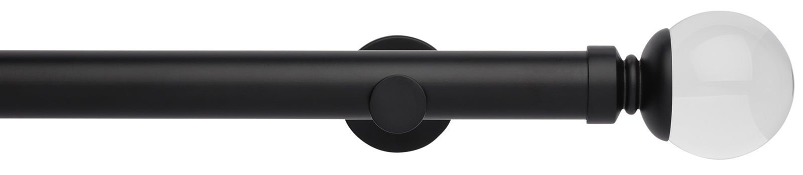 Rolls Neo Premium 35mm by Hallis Hudson Metal Eyelet Curtain Pole in a Matt Black effect finish with Clear Ball finials and cylinder brackets. A stunning addition to the ever popular Rolls Neo collection of contemporary metal curtain poles with a stylish, minimalistic look.