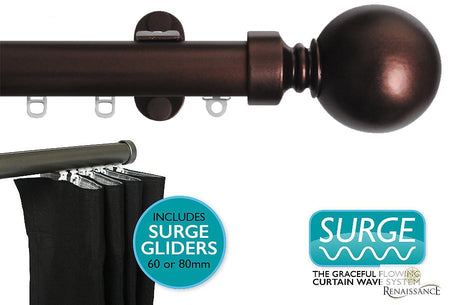 Renaissance 28mm Distinction Metal Curtain Pole with Surge heading in Antique Bronze with Sphere finials. The Distinction curtain poles are a blend of elegance and functionality, the clean and smart look fits in with the most contemporary decor, whilst at the same time not looking out of place in the most traditional settings.