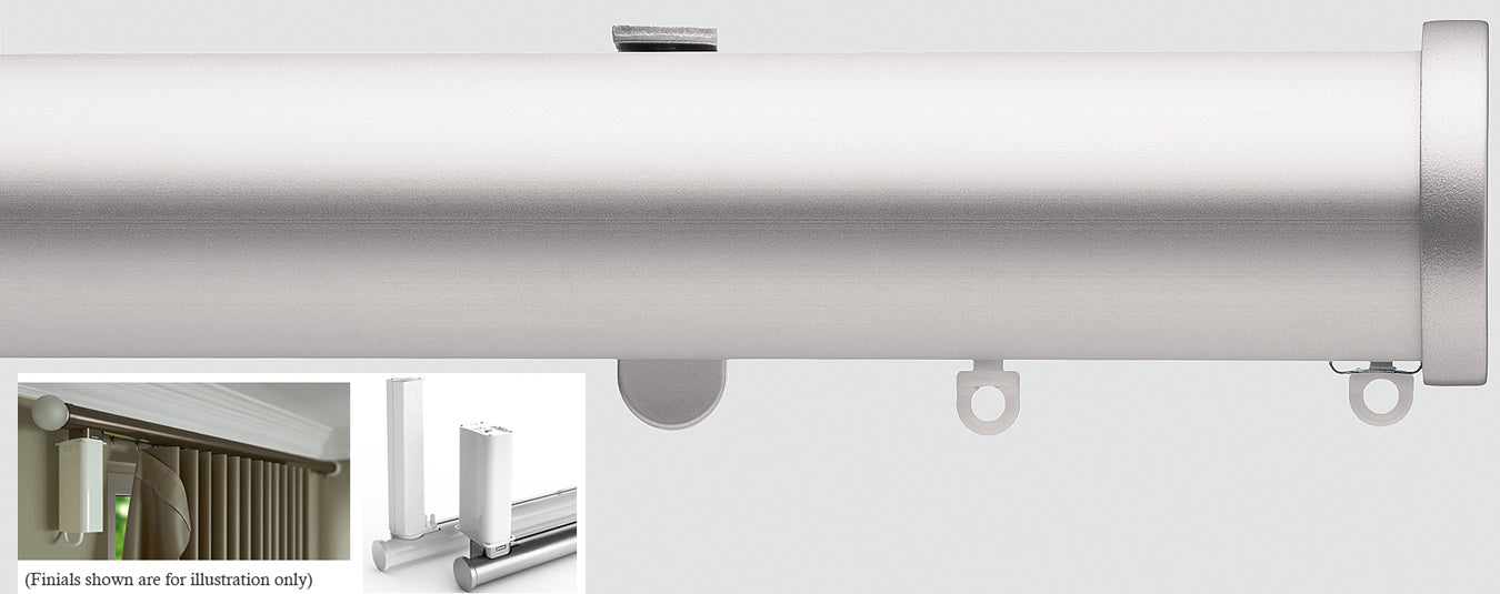 Silent Gliss Motorised Metropole 50mm Curtain Pole System 7650 with system 5100 Autoglide track and Motor 5190 in Silver with Endcap finials. Silent Gliss Motorised Metropole 50mm Curtain Poles are fully assembled and supplied with adjustable wall fixing brackets as standard, require no pre-wiring and are an excellent security device when homes are unoccupied.