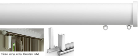 Silent Gliss Motorised Metropole 50mm Curtain Pole System 7650 with system 5100 Autoglide track and Motor 5190 in White with Endcap finials. Silent Gliss Motorised Metropole 50mm Curtain Poles are fully assembled and supplied with adjustable wall fixing brackets as standard, require no pre-wiring and are an excellent security device when homes are unoccupied.