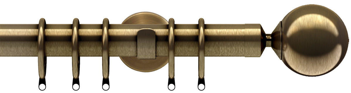 Speedy Poles Apart 28mm Curtain Pole in an Antique Brass finish with Sphere finials and IDC cylinder brackets. The fixed pole set is supplied with all fittings including adjustable cylinder brackets which help to avoid obstructions such as deep windowsills and radiators. Rings are lined to allow a smooth, quiet travel along the pole.