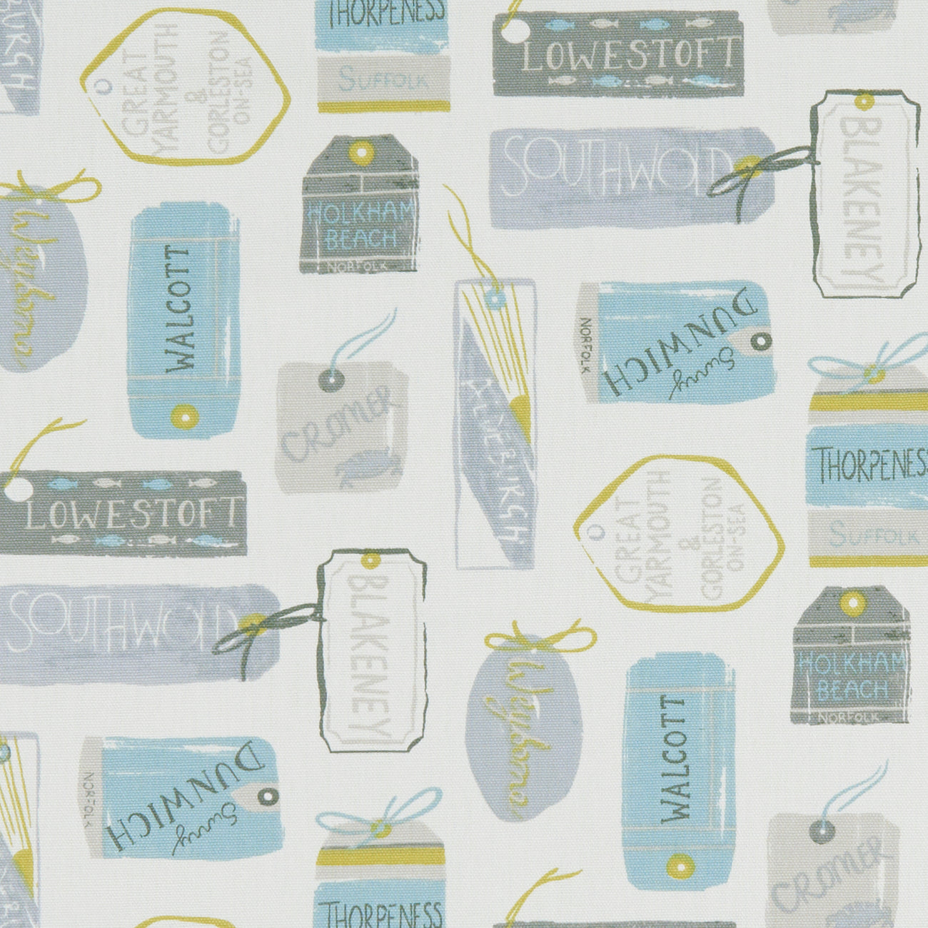 Studio G Land & Sea Explorer fabric in a Mineral colourway. Explorer is a printed panama cotton fabric with a whimsical ticket design. The open heathland and sweeping coastline of Suffolk & Norfolk, influence this eclectic collection of 16 contemporary prints. Charming coastal scenes and marine motifs are accompanied by birdlife, hedgerow and nature inspired designs. These nostalgic designs are also available as PVC.