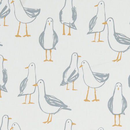 Studio G Land & Sea Laridae fabric in a Natural colourway. Laridae is a printed panama cotton fabric with a Seagull design. The open heathland and sweeping coastline of Suffolk & Norfolk, influence this eclectic collection of 16 contemporary prints. Charming coastal scenes and marine motifs are accompanied by birdlife, hedgerow and nature inspired designs. These nostalgic designs are also available as PVC.
