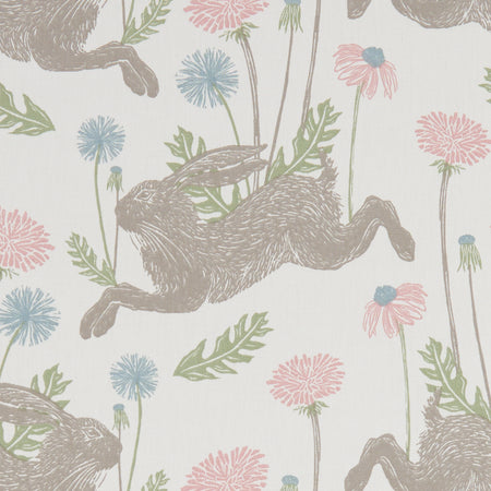Studio G Land & Sea March Hare fabric in a Pastel colourway. March Hare is a printed panama cotton fabric with a whimsical Hare design. The open heathland and sweeping coastline of Suffolk & Norfolk, influence this eclectic collection of 16 contemporary prints. Charming coastal scenes and marine motifs are accompanied by birdlife, hedgerow and nature inspired designs. These nostalgic designs are also available as PVC.