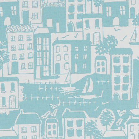 Studio G Land & Sea Waterside fabric in a Duckegg colourway. Waterside is a printed panama cotton fabric with a seaside village design. The open heathland and sweeping coastline of Suffolk & Norfolk, influence this eclectic collection of 16 contemporary prints. Charming coastal scenes and marine motifs are accompanied by birdlife, hedgerow and nature inspired designs. These nostalgic designs are also available as PVC.