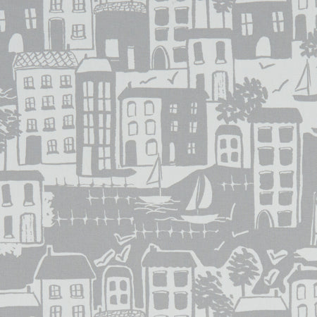 Studio G Land & Sea Waterside fabric in a Grey colourway. Waterside is a printed panama cotton fabric with a seaside village design. The open heathland and sweeping coastline of Suffolk & Norfolk, influence this eclectic collection of 16 contemporary prints. Charming coastal scenes and marine motifs are accompanied by birdlife, hedgerow and nature inspired designs. These nostalgic designs are also available as PVC.