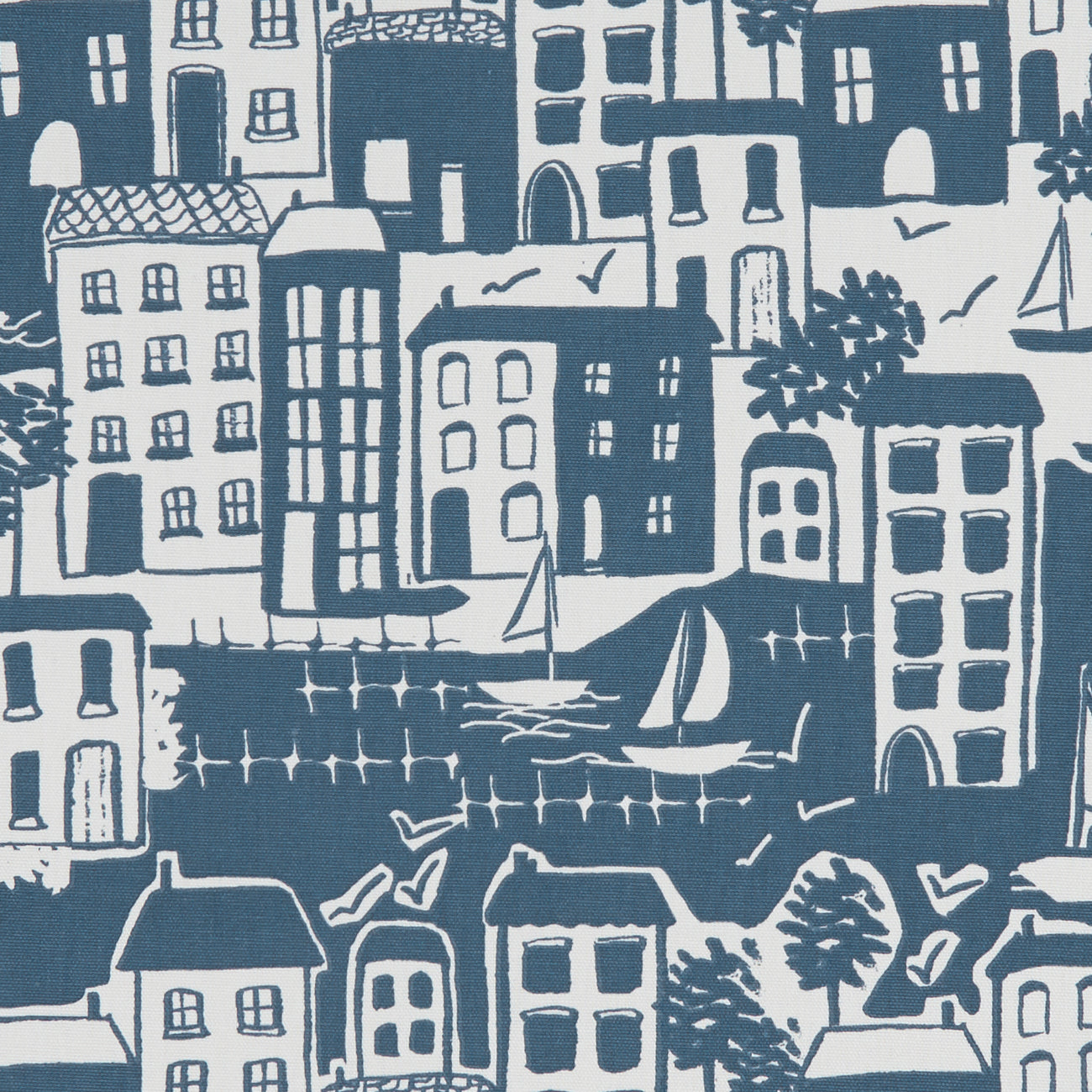Studio G Land & Sea Waterside fabric in a Navy colourway. Waterside is a printed panama cotton fabric with a seaside village design. The open heathland and sweeping coastline of Suffolk & Norfolk, influence this eclectic collection of 16 contemporary prints. Charming coastal scenes and marine motifs are accompanied by birdlife, hedgerow and nature inspired designs. These nostalgic designs are also available as PVC.